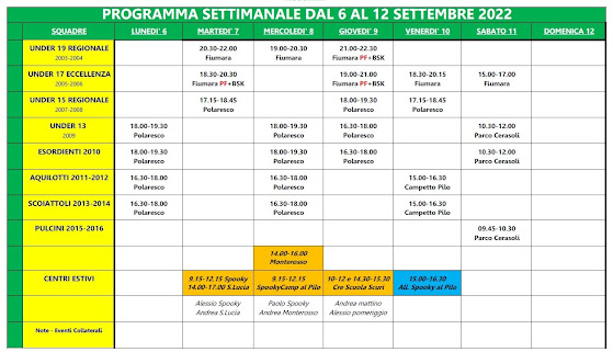 Con piacere pubblichiamo il programma allenamenti per le squadre del Settore Giovanile e del Minibasket Lussana per la settimana che va da lunedì 6 a domenica 12 settembre 2021.